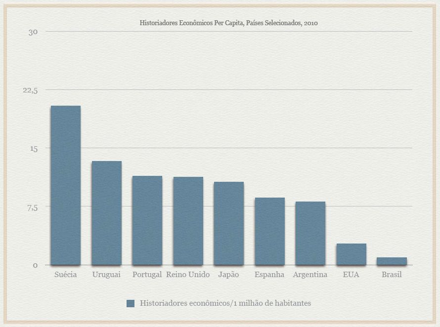 De acordo com um levantamento feito em uma pesquisa de Jörg Baten e Julia Muschallik, da Universidade de Tübingen, a distribuição geográfica dos historiadores econômicos pelo mundo é bastante desigual, considerando a população dos países. E no caso do Brasil, ainda se tem de formar muitos pesquisadores na área (embora os dados não sejam lá muito bons). Veja o gráfico abaixo, com países selecionados.