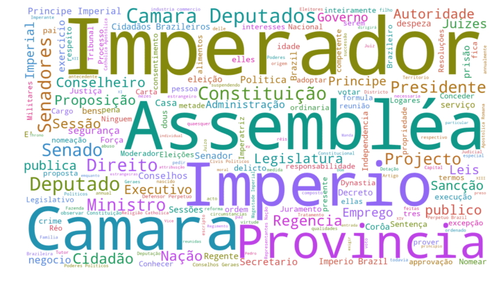 Abaixo, as palavras mais frequentes (= com maior tamanho) extraídas dos textos da Constituição de 1824 e da reforma constitucional dez anos depois, o chamado Ato Adicional de 1834, no que parece uma boa síntese das mudanças políticas e institucionais ocorridas no início da década de 1830. Até aparecem “municipio”, “municipal” e “municipaes” em 1834, fato raro nas constituições brasileiras.