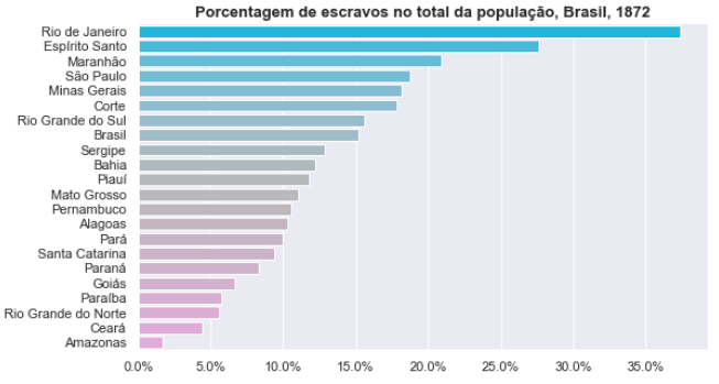 Participação dos escravos na população das províncias do Brasil em 1872: Minas Gerais possuía o maior número absoluto de escravos, mas a participação relativa de cativos no total da população era bem maior no Rio de Janeiro (37,4%), Espírito Santo (27,6%) e Maranhão (20,9%).